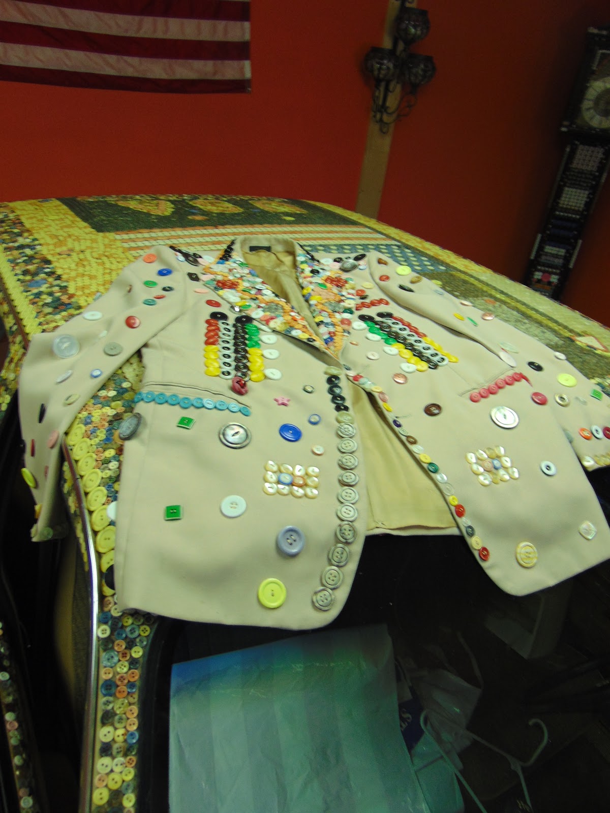 After running out of room for buttons on the suit, Mr. Stevens discovered the allure of contact cement. He glued 517 buttons on his shoes, then 3,005 on his guitar, and then about 517 buttons on his shoes. His insomnia became an asset. Next Mr. Stevens covered a banjo, then a piano, then his 1983 Chevy Chevette with a whopping 150,000 buttons!