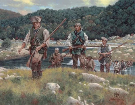 | Colonel Issac Shelby's Overmountain Men crossing the Pacolet River on their way to face the Loyalists at Musgrove's Mill in mid-August 1780. |
