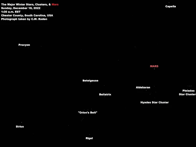 At present, the position of Mars in the night sky puts it just above and between both the Hyades and Pleiades Star Clusters just outside of the Winter Circle (or Winter Hexagon) asterism as you can see in the photos I took earlier this evening and labeled.